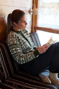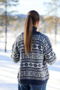 Hyttekofta er en klassisk mønstret jakke i tradisjonell stil, strikket i Pt5, et slitesterkt og maskinvaskbart garn i ull og nylon. Jakken strikkes nedenfra og opp med påsydd stolpe og oppklipp i midten. Mønsteret er bygget opp av border inspirert av gamle kofter, og passer til hele familien. Perfekt til skjermfrie hyttehelger, lesestunder og turopplevelser i frisk luft.
